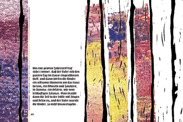 und polychromen, durch Andrückwalzen erstellte Farbflächen und Balken. Diese Flächen ziehen